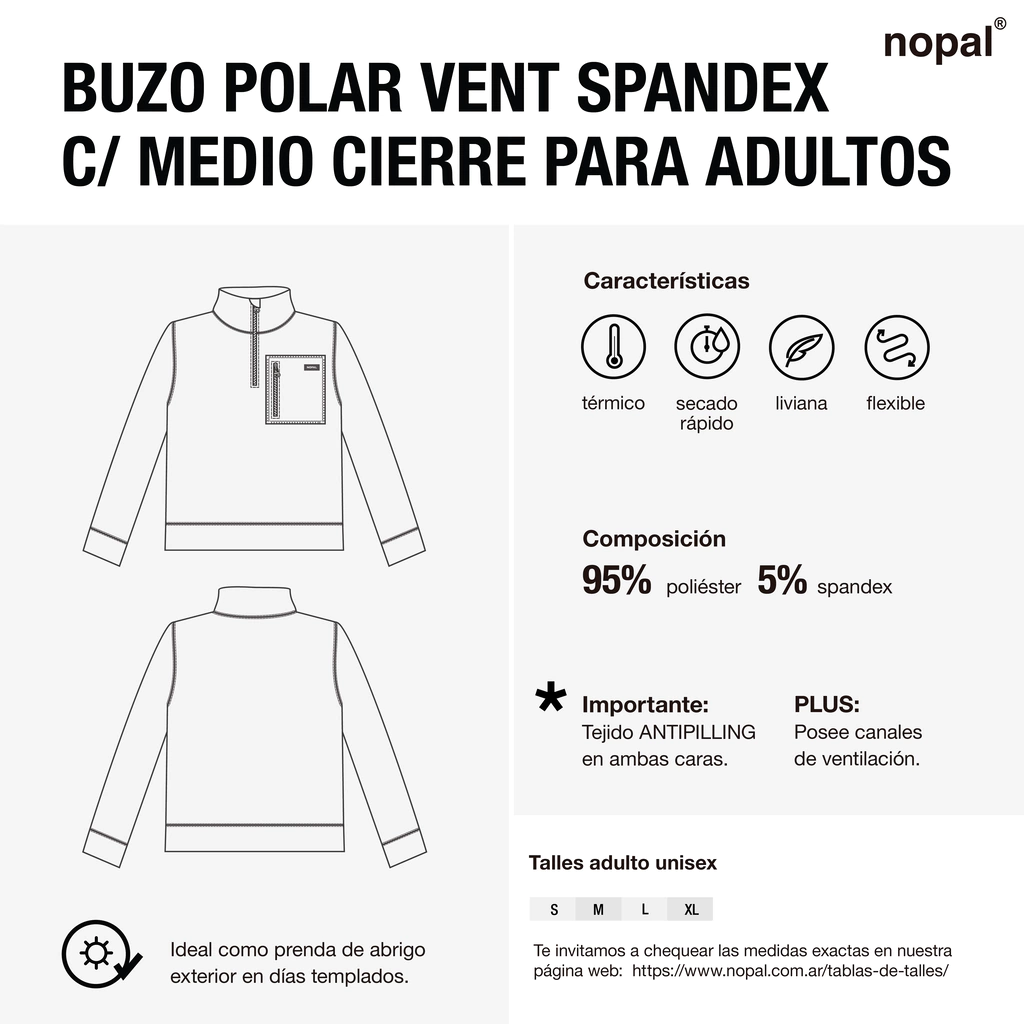 El buzo polar vent spandex de Nopal es el buzo ideal para los días de temperatura templada, posee canales de ventilación lo que los hace ideales para este tipo de temperaturas. El buzo tiene tratamiento antipilling en ambas caras.