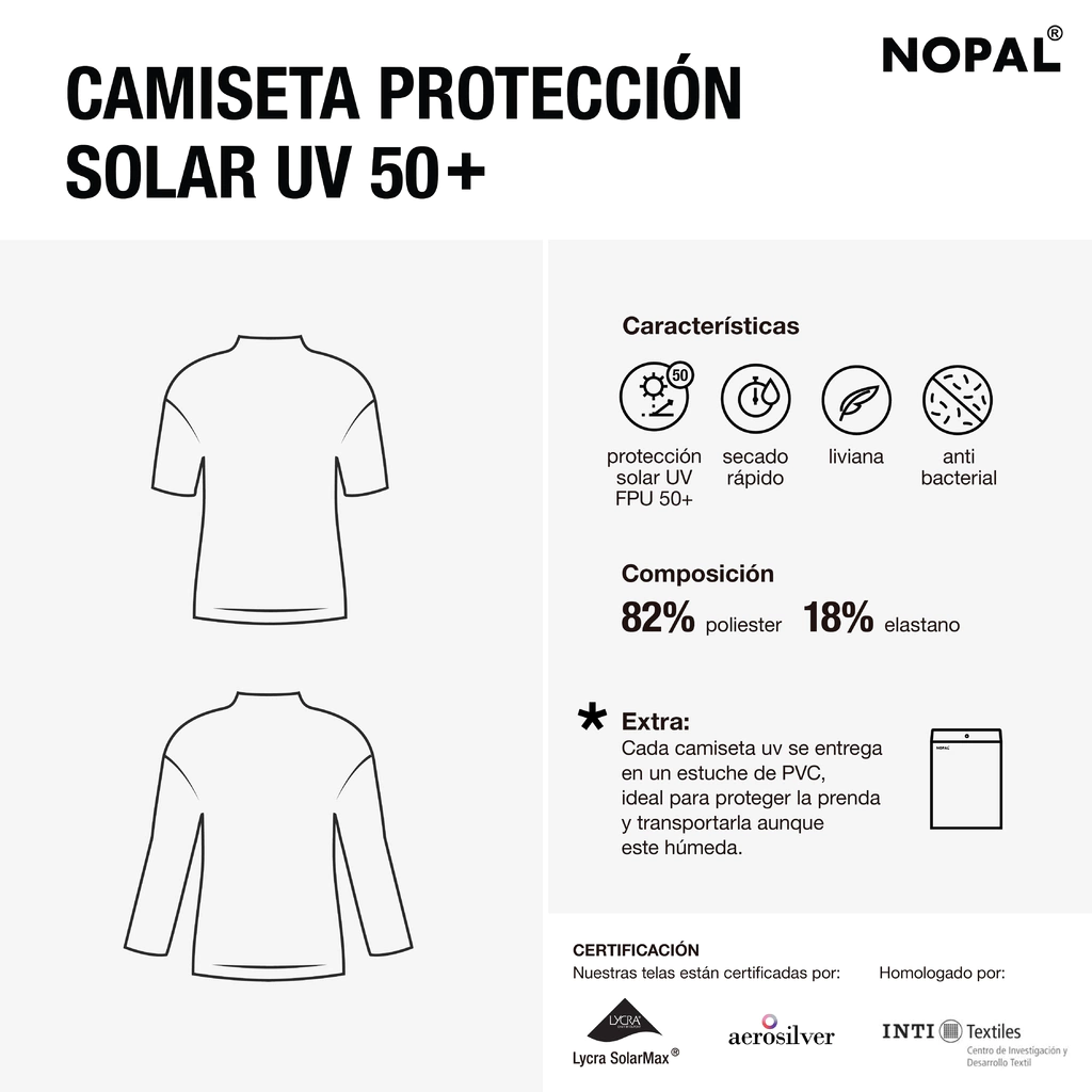 La camiseta de protección solar UV (factor 50) es la prenda ideal para proteger el cuerpo de los rayos ultravioletas del sol. Cada camiseta está certificada y homologada aportando un filtro del 97,5% de los rayos ultravioletas del sol, siendo esta protección la más alta existente para prendas deportivas. Cada camiseta lleva una etiqueta que certifica dicha protección.