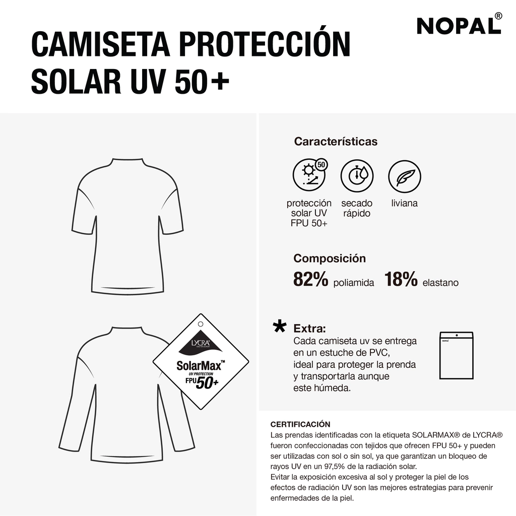 La camiseta de protección solar UV (factor 50) es la prenda ideal para proteger a los niños y niñas de los rayos ultravioletas del sol. Cada camiseta está certificada y homologada otorgando un filtro del 97,5% de los rayos ultravioletas del sol, siendo esta protección la más alta existente para prendas deportivas. Cada camiseta lleva una etiqueta que certifica dicha protección.
