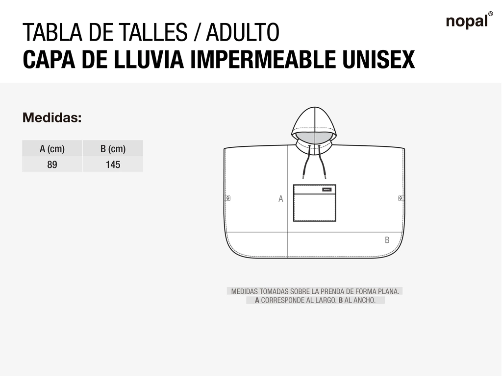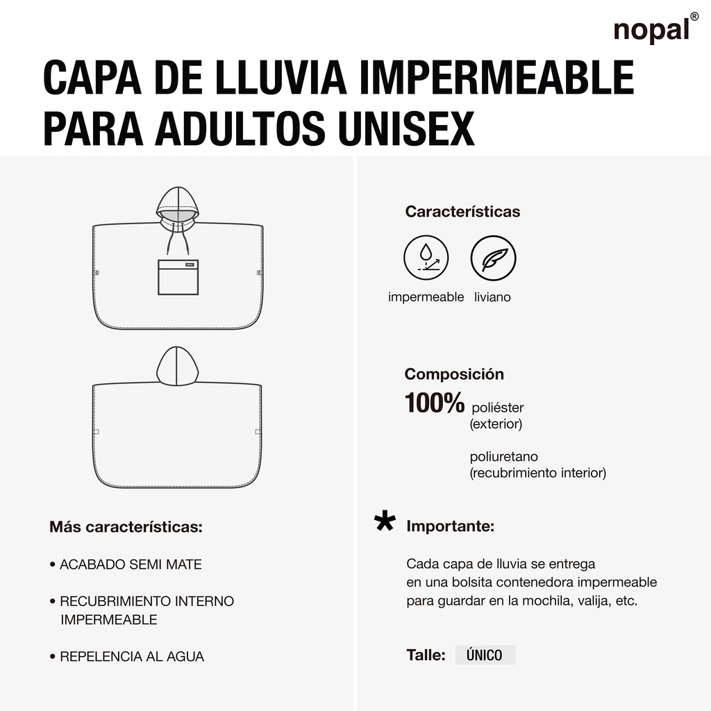 La capa de lluvia impermeable de Nopal es la prenda ideal para siempre tener a mano y asi protegerte cuando te sorprende la lluvia. Fabricada en tela impermeable de altísima calidad logra proteger el cuerpo y la cabeza del agua y la humedad. Posee capucha ajustable y un bolsillo para guardar tus pertenencias que necesitas tener mas a mano. Viene acompañada por una bolsita también de material impermeable que te permitirá guardar la capa de lluvia para tener siempre al alcance. La capa de lluvia impermerables es súper liviana y súper compacta.