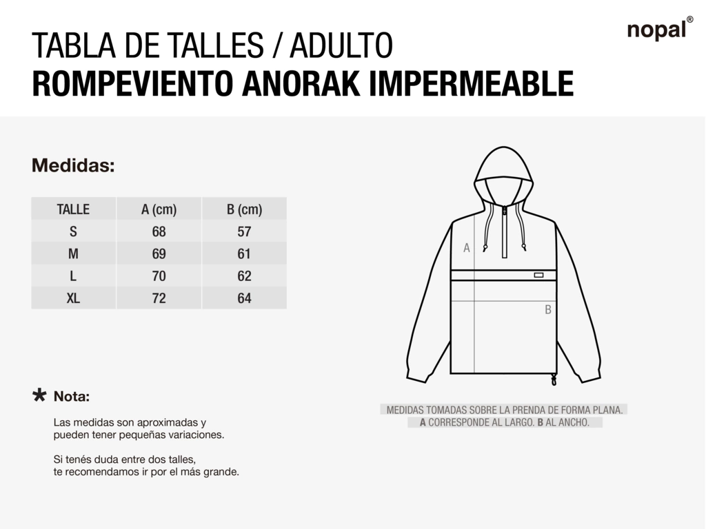 El rompeviento anorak de Nopal es la prenda ideal para llevar a todos lados por su bajo peso y volumen. Confeccionada en tela 100% impermeable posee capucha y cintura ajustable. Tambien posee un bolsillo amplio con cierre para mayor seguridad. Sus puños poseen elástico para lograr una protección total contra el viento y el agua.